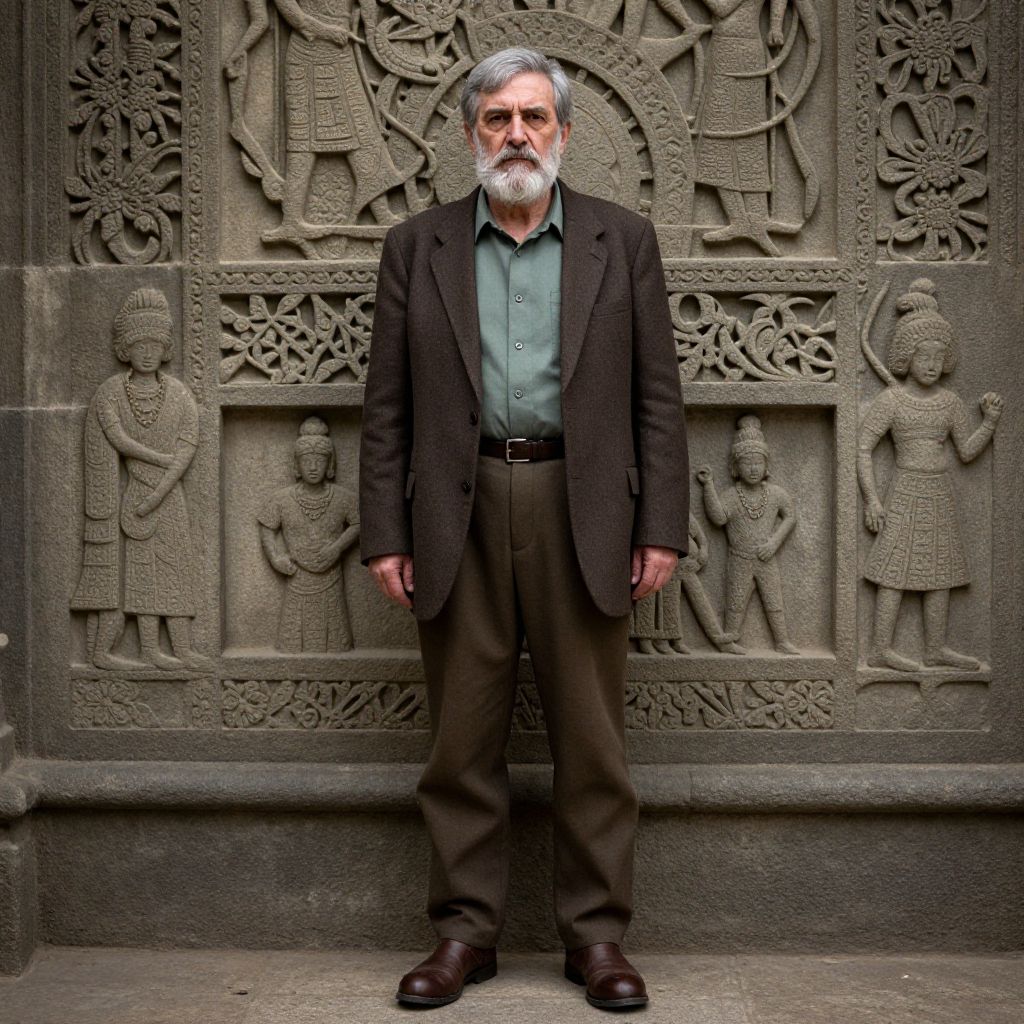 Stern Elder by Ancient Carved Wall