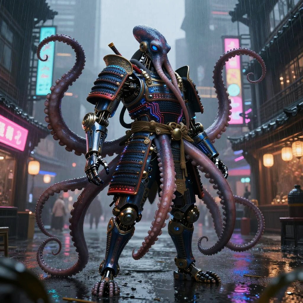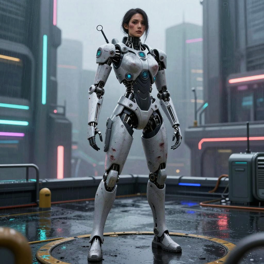Full-body concept art of technologically advanced anthropomorphic fox fighter clad in futuristic powered exosuit, standing in metallic desert wasteland, high-detail sci-fi cyberpunk digital painting, soft studio lighting, Octane Render.
