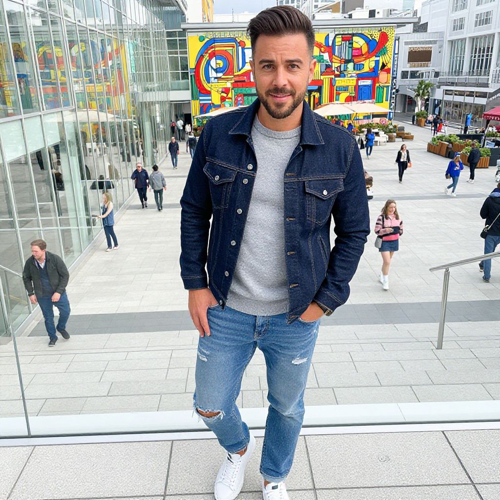 A man, dark indigo denim jacket, grey crew neck sweater, distressed blue jeans, white sneakers, relaxed weekend vibe, modern glass structure, vibrant mural, bustling plaza, overhead shot, casual smile, enjoying the moment. Man has masculine face and piercing eyes