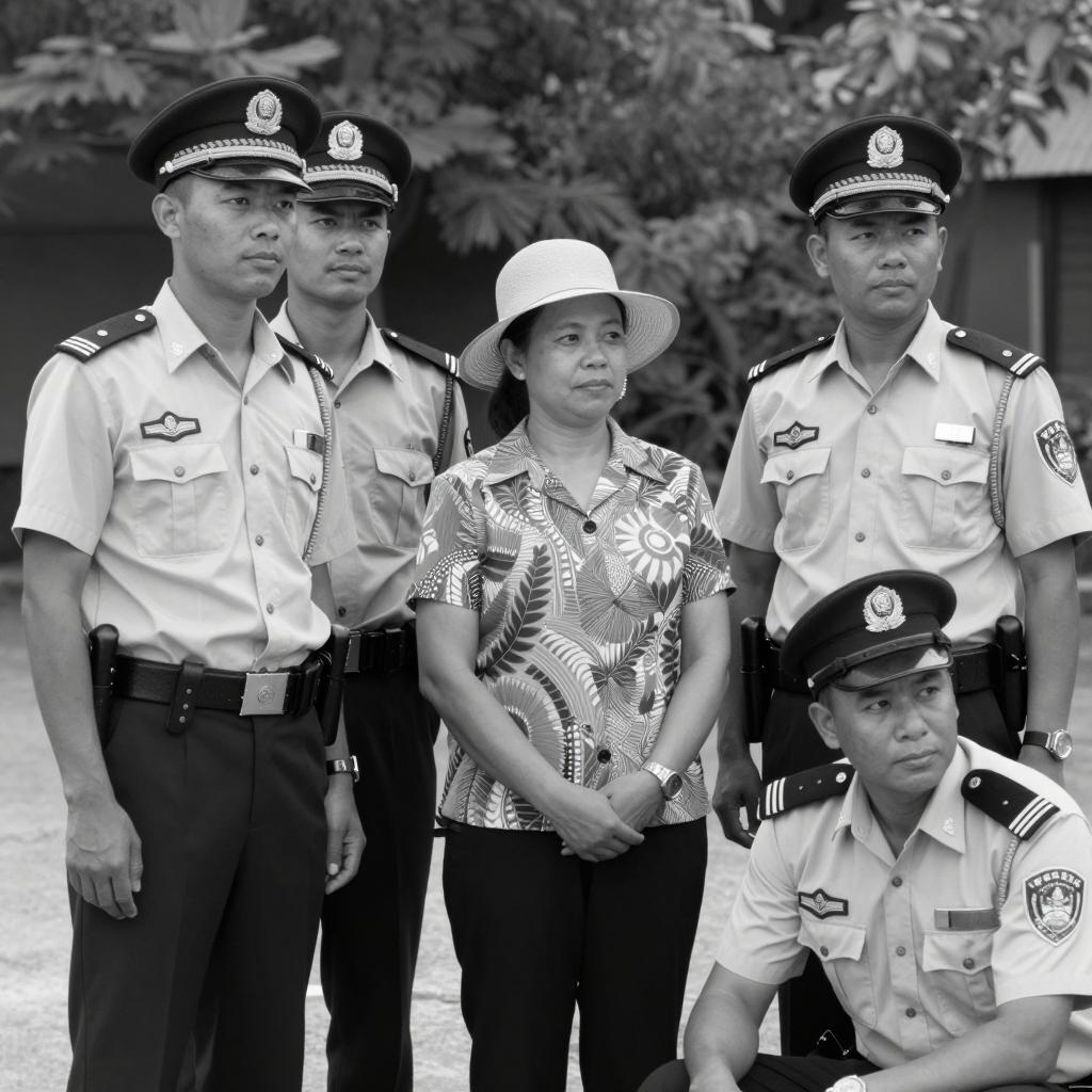 A line of male soldiers in gray uniforms with matching caps, standing outdoors. One officer in a similar uniform but with medals and a higher rank, stands on the right, smiling at the soldiers. The soldiers are looking at him, with neutral to slightly attentive expressions. There are 14 soldiers in total. Background includes a clear sky and indistinct buildings. Soldier on the far left rests his chin on his hand.