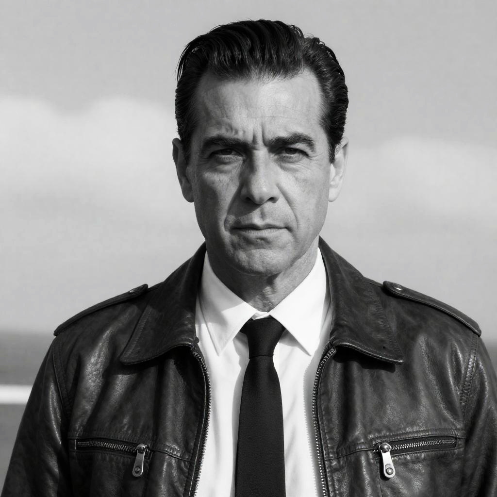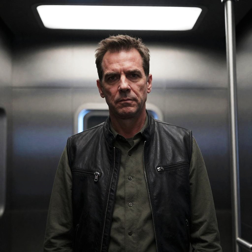 Middle-aged man with short brown hair, serious expression, wearing dark leather vest over green shirt, standing in futuristic metallic room. Bright overhead lights reflect off metal panels behind him. Vertical metal bar on right.