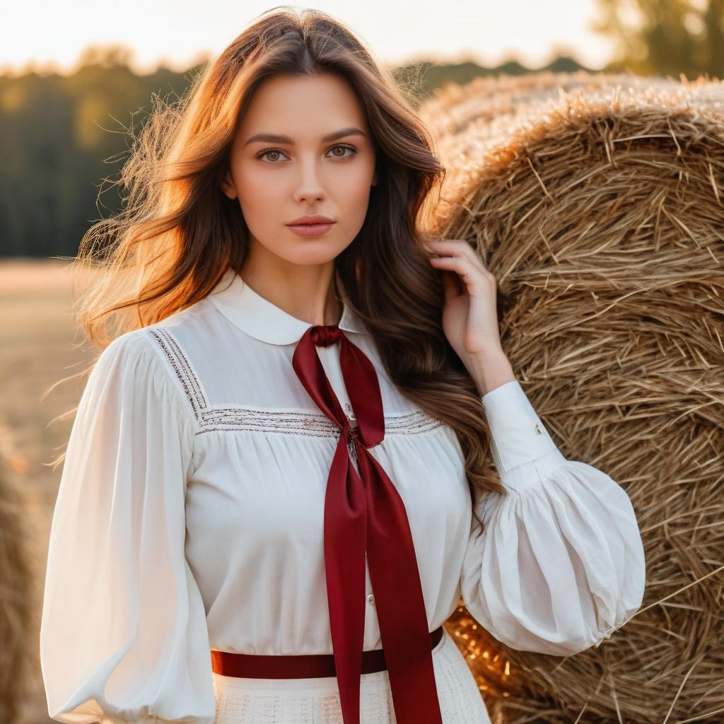 A beautiful young woman with long wavy brown hair and warm brown eyes, wearing a vintage-style white blouse with puffy sleeves and a rust-red ribbon detail, posing with a serene expression beside a stack of dry hay in an outdoor rural setting during golden hour, soft warm sunlight illuminating her face, natural makeup emphasizing her clear skin and expressive eyes, calm and peaceful countryside background with blurred fields