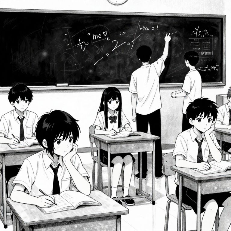 Black-and-white anime-style drawing of a classroom: five students with short black hair, wearing school uniforms, sit at desks; one teacher writes on a