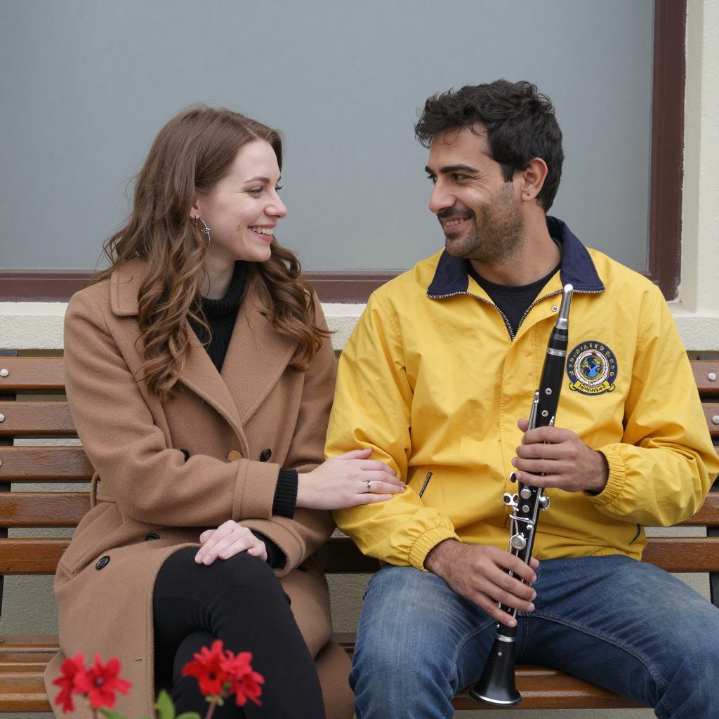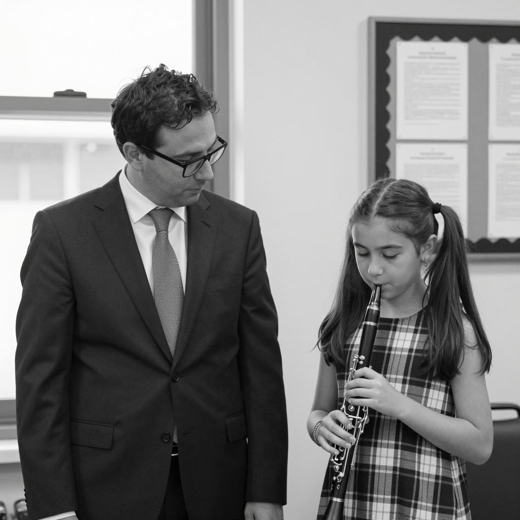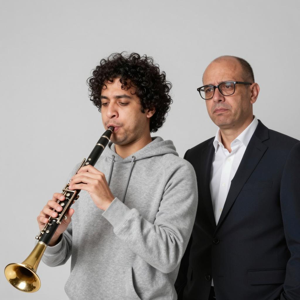 Man with curly black hair, wearing a gray hoodie, plays a golden clarinet. Beside him, a man with glasses, balding, wearing a dark suit and white shirt. Both stand against a plain, light gray background. Man playing clarinet looks focused, while the man in the suit looks slightly bored. Two people.
