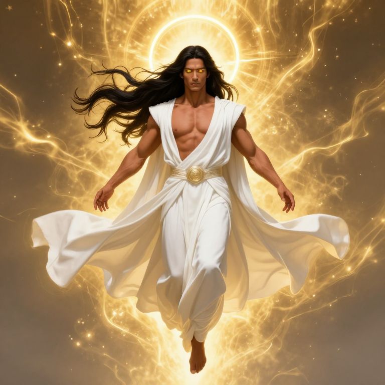 The Emperor of Mankind with tan skin and long black hair, bright gold eyes, wearing white robes with a bare muscular chest, floating above the ground, surrounded by a golden aura and a golden halo behind his head
