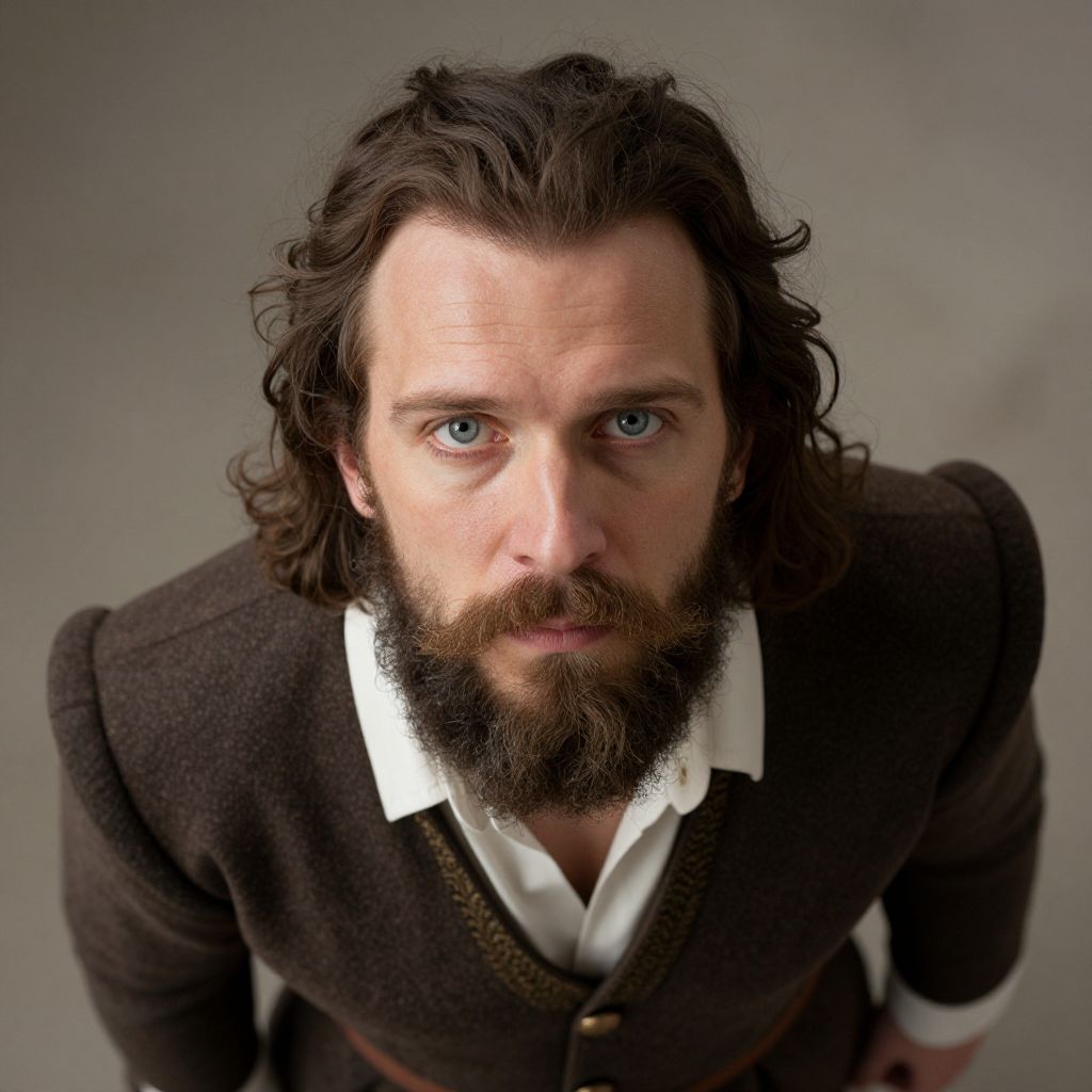 Photograph of a Caucasian man with fair skin, blue eyes, and a thick, curly brown beard and hair. He has a slightly intense expression and is looking directly at the camera. He is wearing a dark brown, textured woolen blazer over a white dress shirt with a partially unbuttoned collar. The background is a plain, gray gradient, putting full focus on the man. The image is taken from a slightly high angle, emphasizing his facial features. The lighting is soft, highlighting his facial hair and eyes.