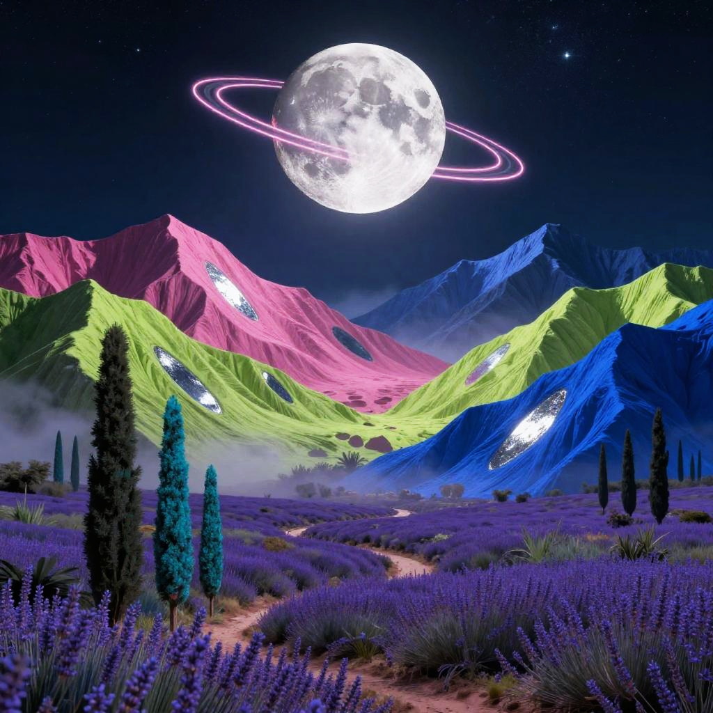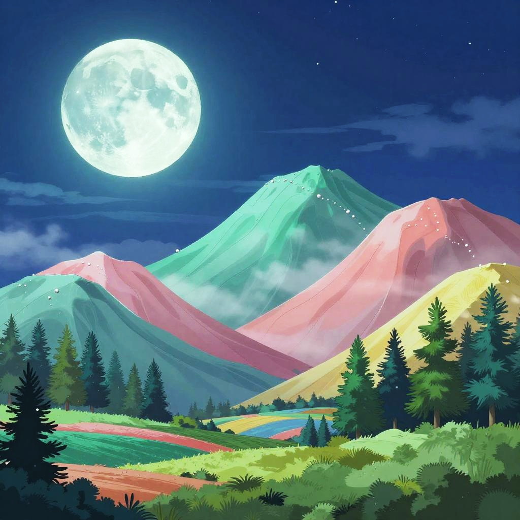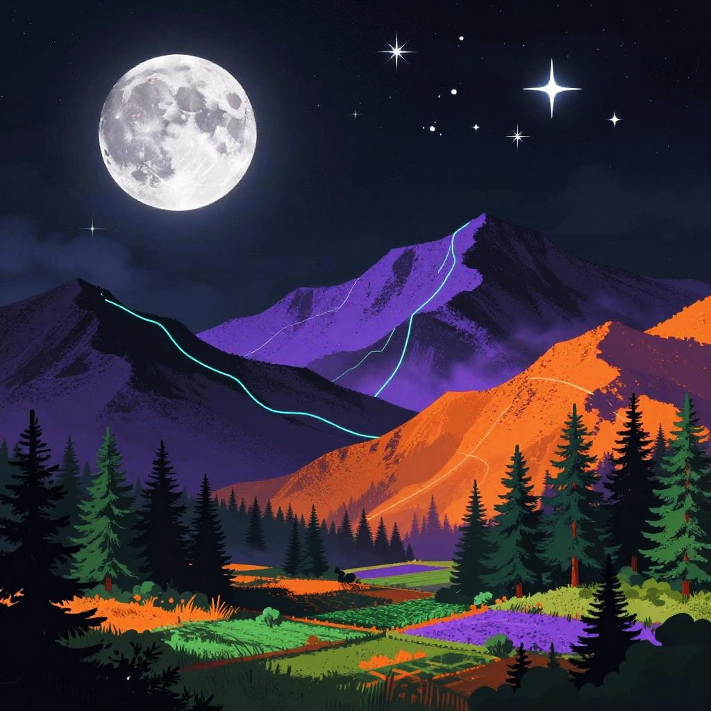 Dreamy nocturne in glitch art, featuring a flickering fragmented moon with pixelated star clusters. Wavy multicolored mountains arc across the midground in electric purple, neon orange, and black with bright cyan lines, guiding the eye to emerald pines and patchwork fields in the foreground. Textured starfield, soft glow, luminous edges, drifting mist between peaks, high detail, richly saturated yet balanced, tranquil atmosphere, wide composition.