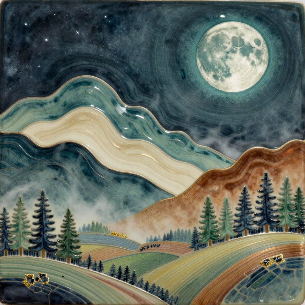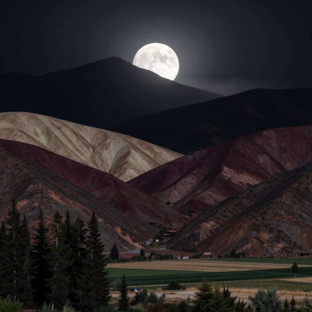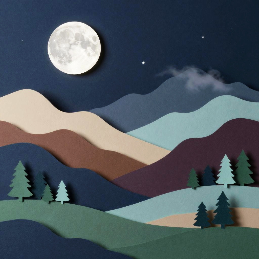 Dreamy nocturne in glitch art, featuring a flickering fragmented moon with pixelated star clusters. Wavy multicolored mountains arc across the midground in electric purple, neon orange, and black with bright cyan lines, guiding the eye to emerald pines and patchwork fields in the foreground. Textured starfield, soft glow, luminous edges, drifting mist between peaks, high detail, richly saturated yet balanced, tranquil atmosphere, wide composition.
