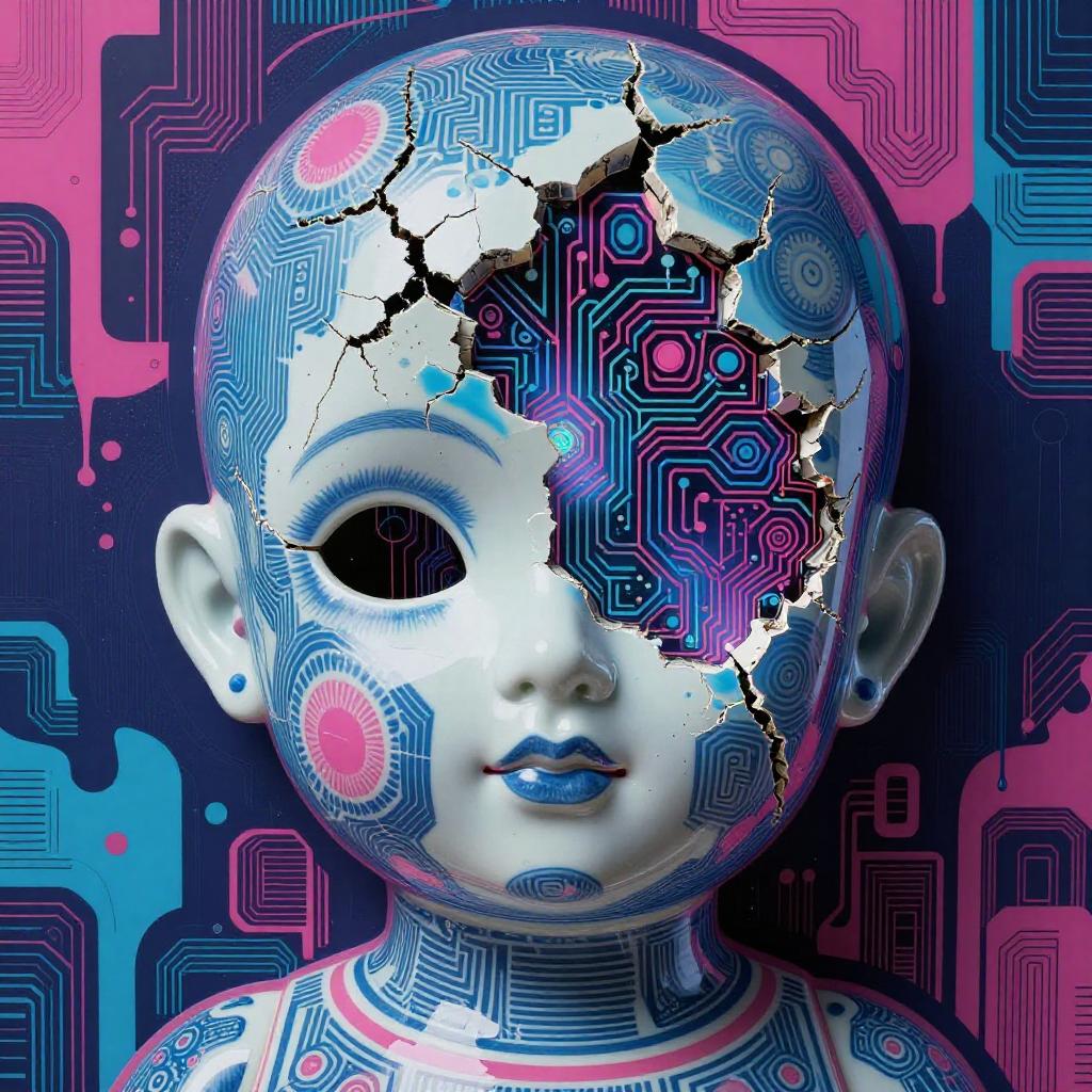 Android, sexy, high_quality, highres, detailed, masterpiece, best quality, absurdres, 8k, HDR, bold linocut print aesthetic, electric cyan and magenta, a porcelain doll face cracking to reveal holographic circuitry fractals within intricate, obsessive linework creating complex patterns over the form, graphic novel style claustrophobic framing, figure tightly packed within abstract shapes, surface resembling cracked porcelain or dried earth, abstract paint splatters and drips obscuring details, Expressiveh