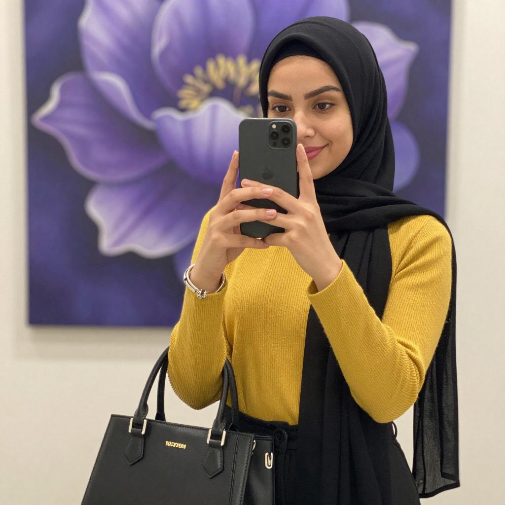 Photograph of a young woman with light skin and dark eyes, wearing a black hijab and yellow ribbed sweater, taking a mirror selfie with a black smartphone. She has a small smile, black pants, and a silver bracelet. A black handbag is on the floor in front of her. A vibrant purple floral painting is in the background.