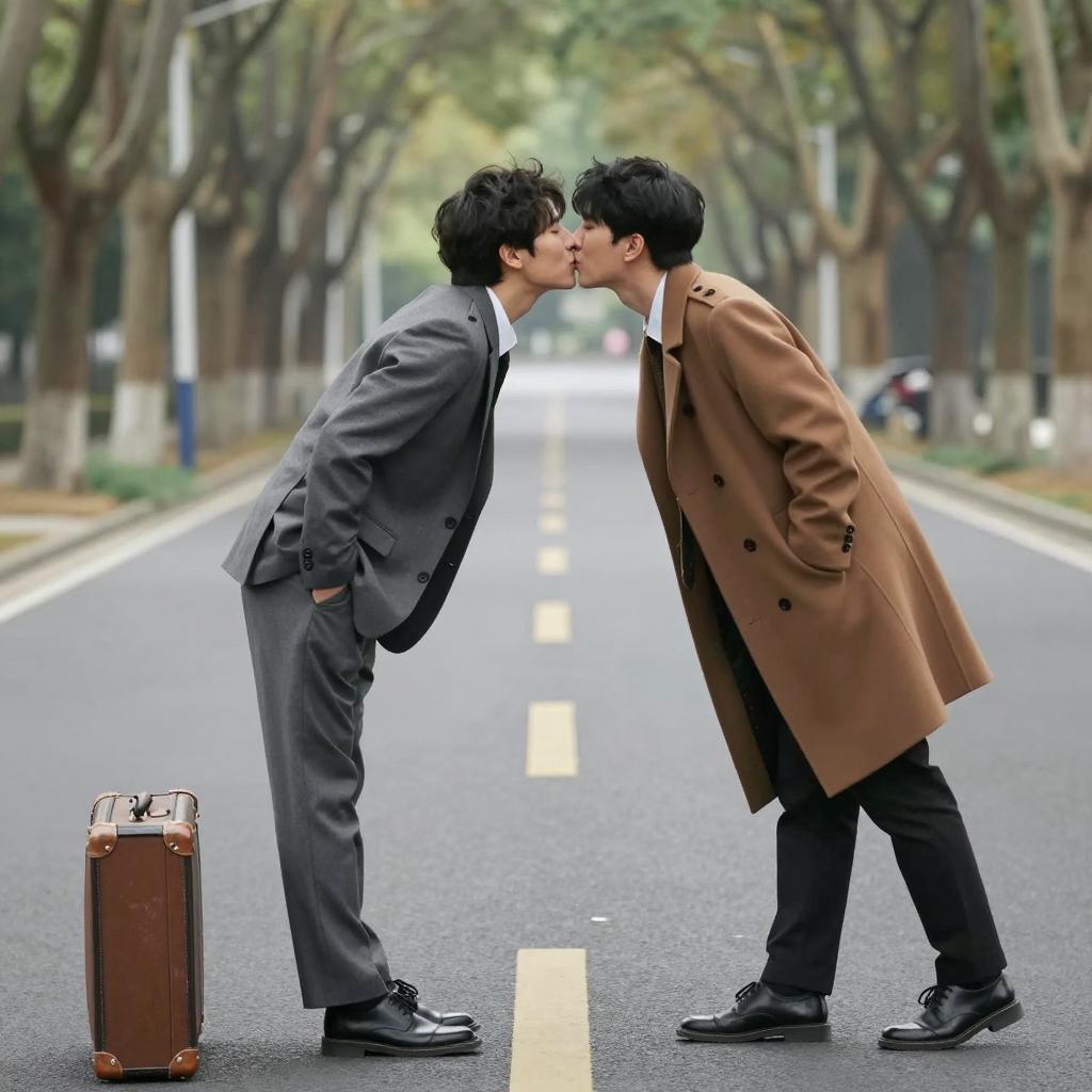 Two men on a tree-lined road. One in a gray suit, black shoes, black hair, bent forward, arm raised. Other in a brown coat, black shoes, black hair, leaning in. Road with white lines, old suitcase on left. Both mid-kiss.