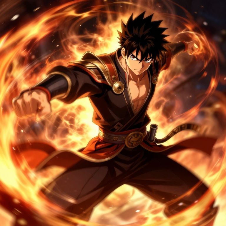 Digital anime-style illustration of a muscular, young male character with spiky black hair and intense blue eyes. He is surrounded by swirling, vivid orange and yellow flames. He wears a black, open-collared martial arts robe with gold trim and a round, medallion-like ornament at the collar. His right arm extends forward, while his left arm is back, both hands glowing with fire. The background is dark, emphasizing the bright flames. His expression is determined, and the dynamic motion of the flames creates a sense of powerful energy and movement. The image has a dramatic and intense atmosphere.