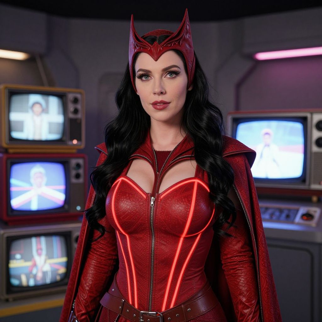A cinematic portrait of a woman in a scarlet witch retro costume, standing inside a retro-futuristic museum with old-school technology displays and vintage TV screens showing 1980s pop culture, the outfit highlighted with glowing red lines and a vintage-style cloak; she has a soft feminine face with long black hair and a focused, mysterious gaze.. The woman has big tits and cute face