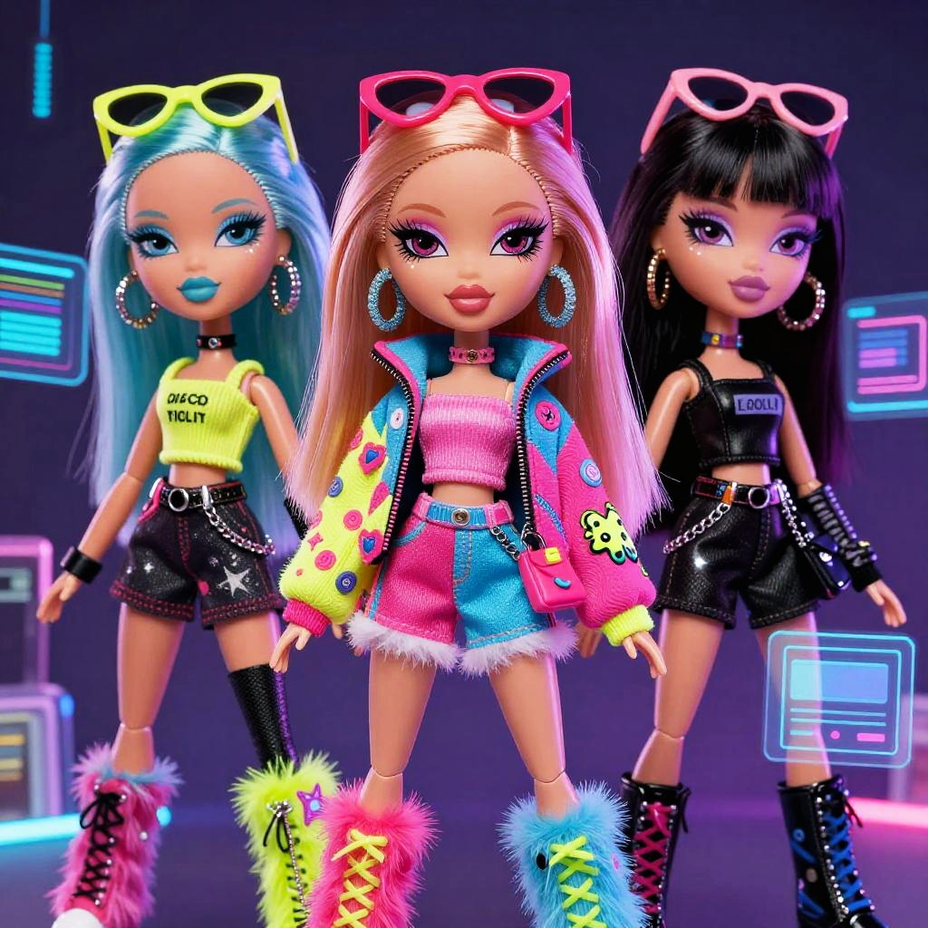 Photograph of three colorful Barbie dolls in neon outfits, each with unique accessories (sunglasses, earrings, boots), standing in a futuristic neon-l