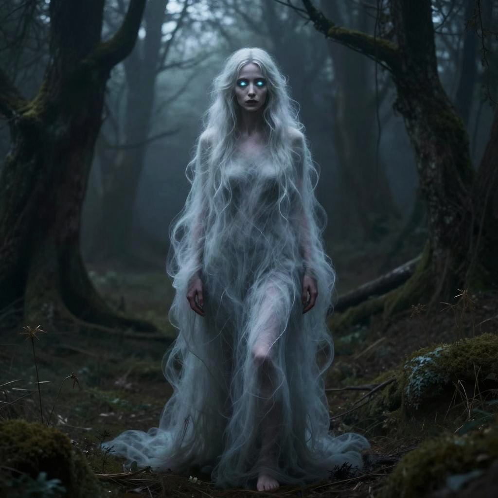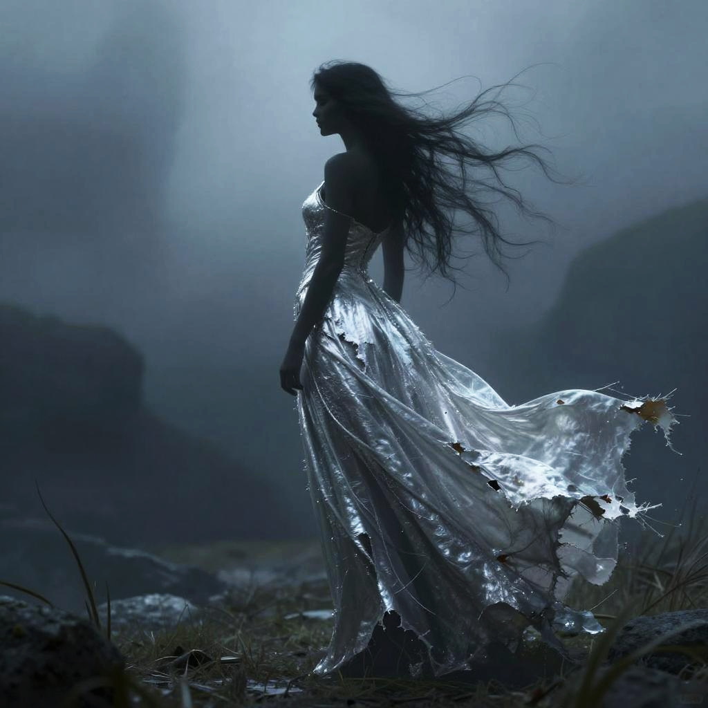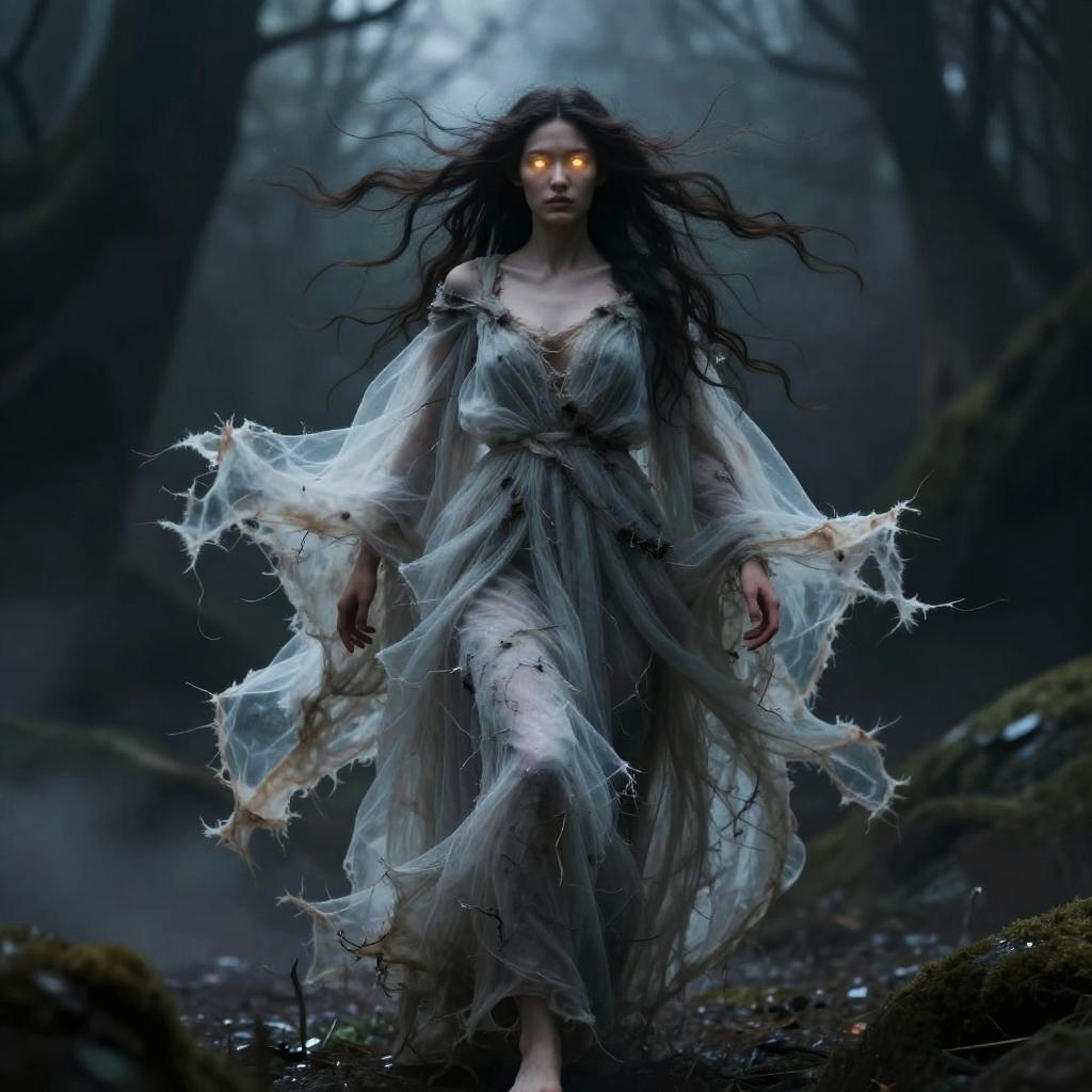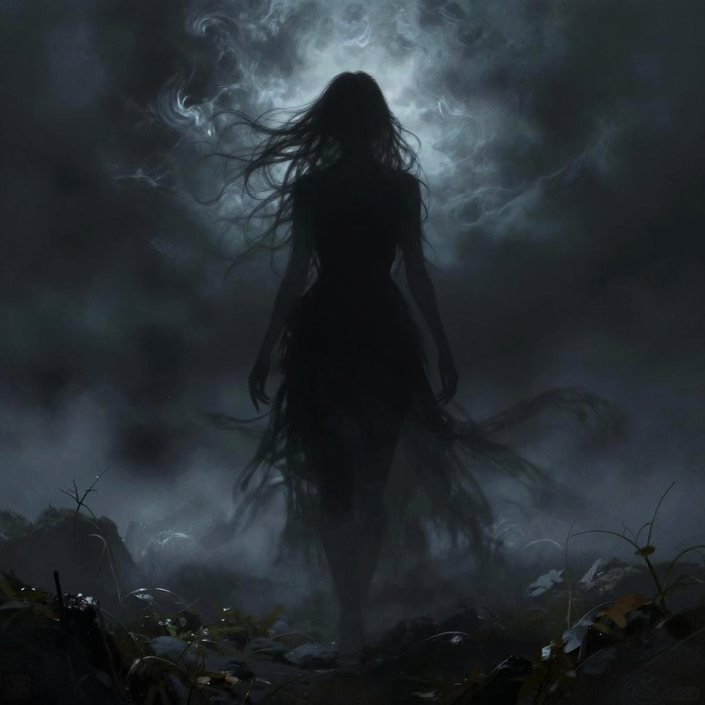 BANSHEE: A female spirit from Irish mythology. Features ghostly silhouette, full body, stormy night with swirling fog in digital painting, Genzoman-inspired, detailed mythical character. Captured with a haunting yet beautiful aesthetic.