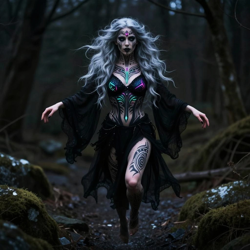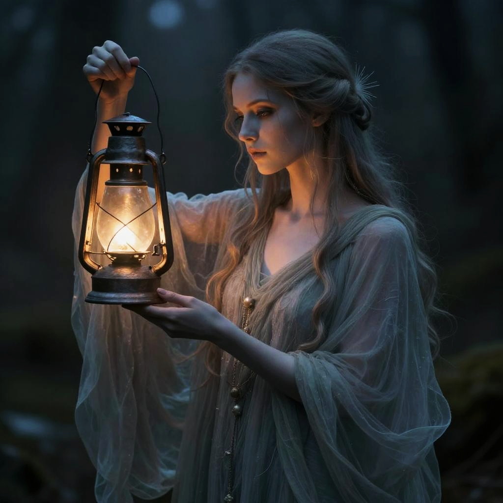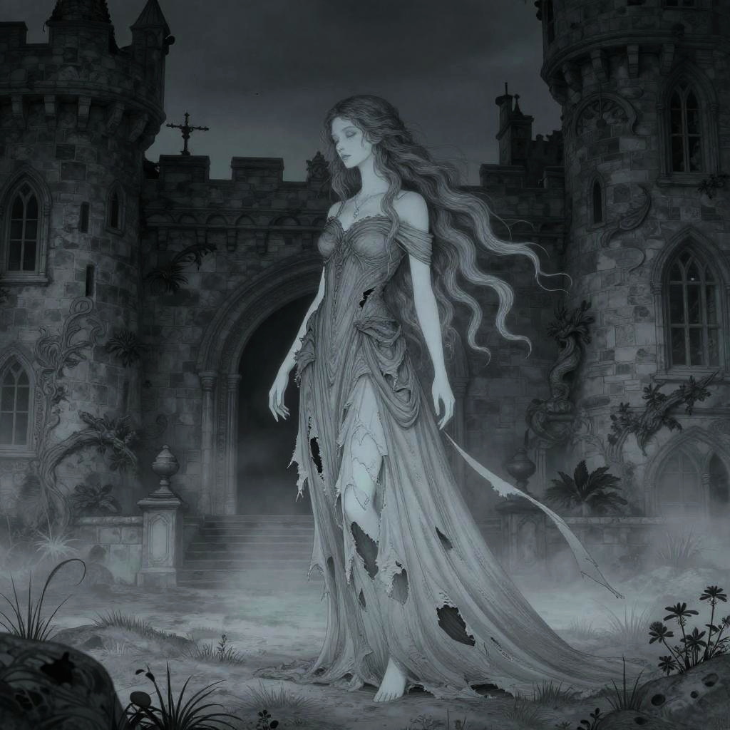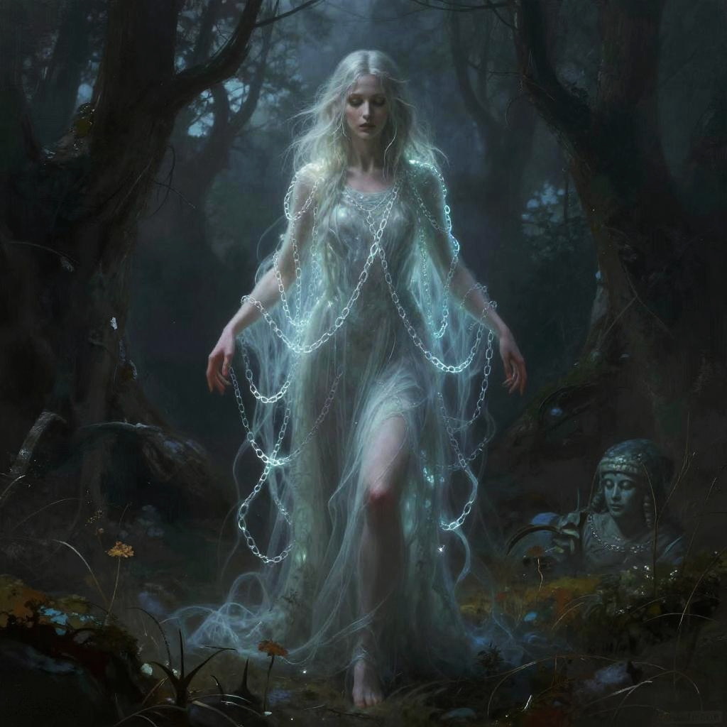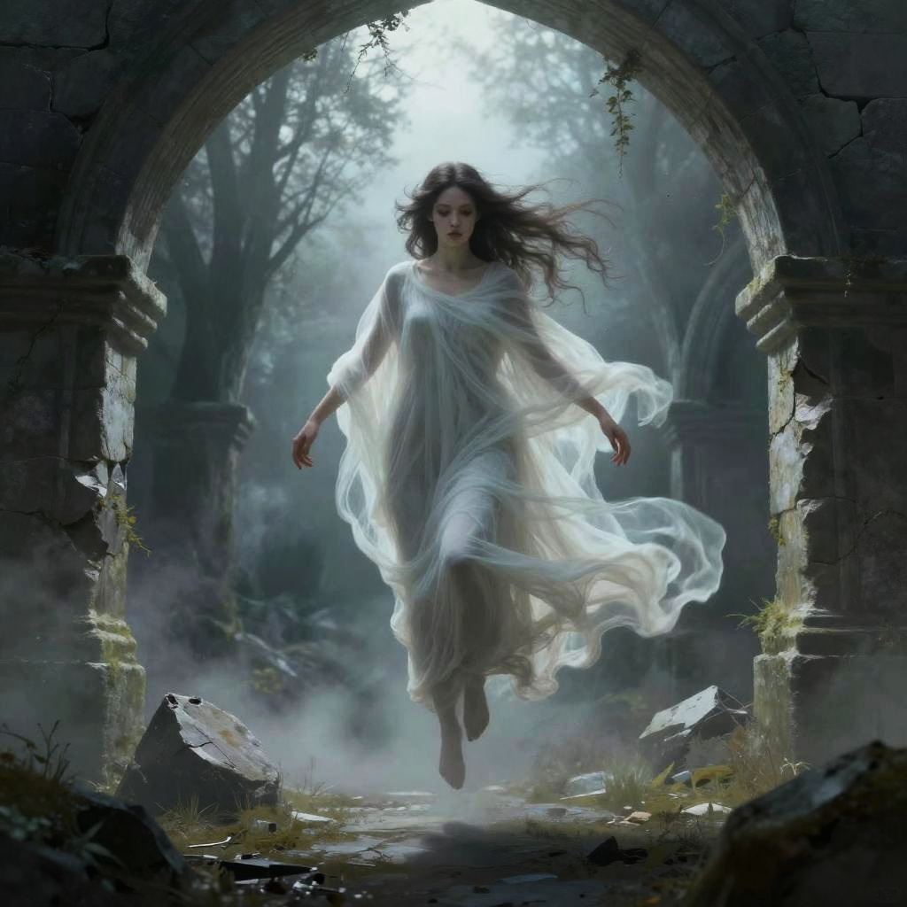 BANSHEE: A female spirit from Irish mythology. Features ghostly silhouette, full body, stormy night with swirling fog in digital painting, Genzoman-inspired, detailed mythical character. Captured with a haunting yet beautiful aesthetic.