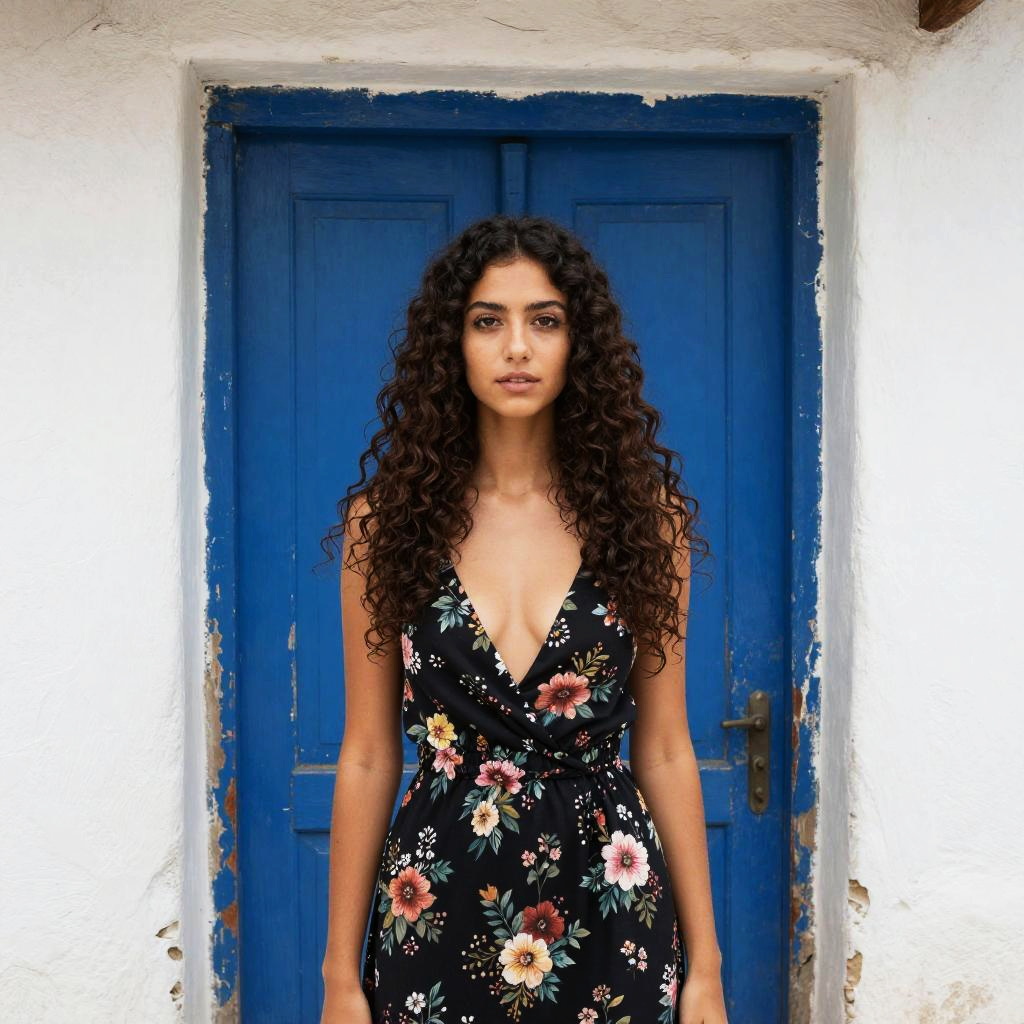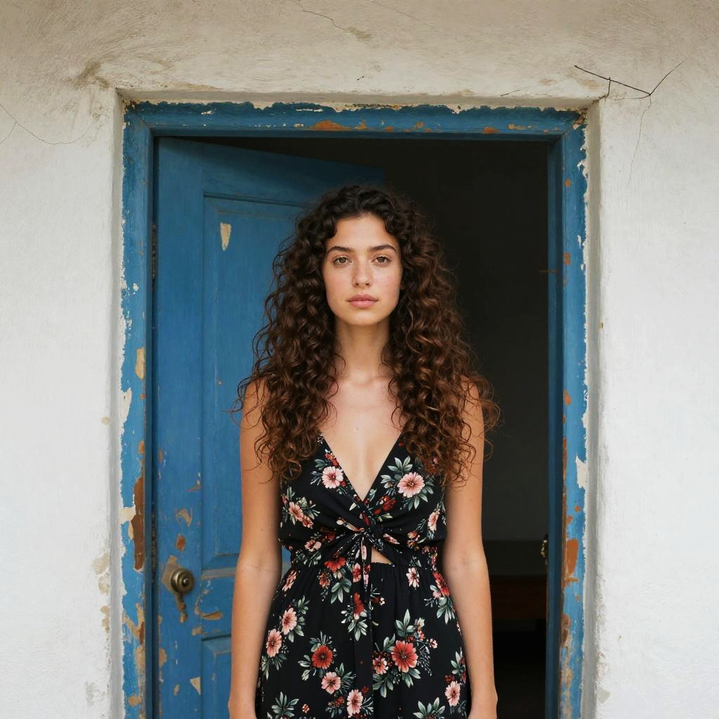 Photograph of a young woman with long, curly dark brown hair standing in a rustic doorway. She's wearing a black floral dress with a deep V-neck, revealing a slim build. The blue door behind her is chipped and worn, contrasting with the white, textured wall. She has a neutral expression and a light olive skin tone. The lighting is natural, highlighting her features.