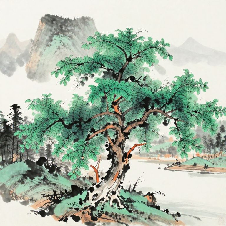China national tree prominently featured in a serene ancient Chinese landscape, vibrant green leaves, traditional ink wash painting style with misty mountains in the background