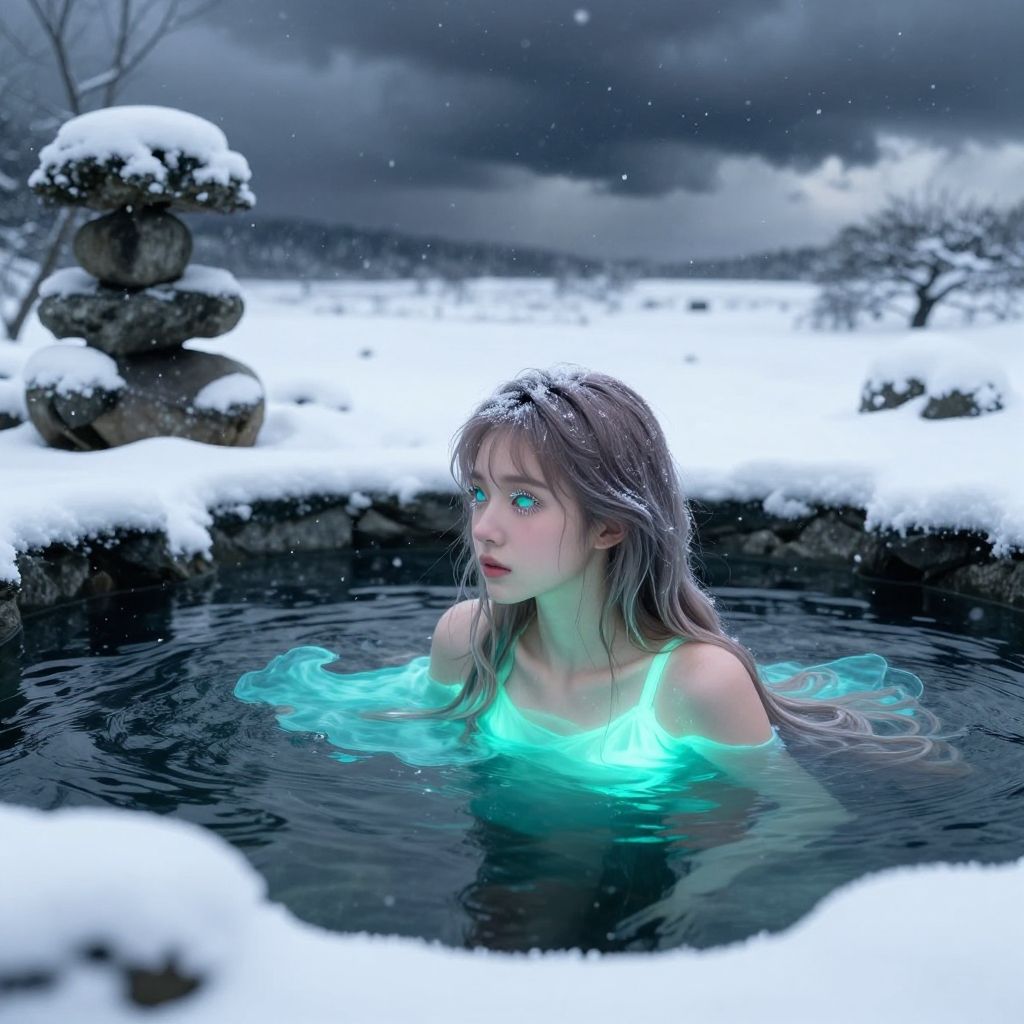 A digital fantasy artwork depicts a fair-skinned, blue-eyed young woman with wet, long brown hair, partially submerged in a glowing turquoise pool of water. She gazes into the distance with a serene expression. Snow blankets the ground and a stack of rocks is visible in the background, under a stormy, dark gray sky. Her illuminated hair and water contrast starkly with the white snow, creating a magical, ethereal atmosphere. The image combines realistic textures with a fantastical, otherworldly style.