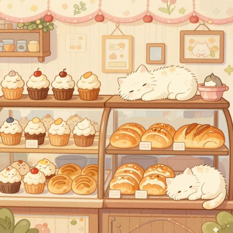 Cute white fluffy cat naps on bakery shelves with cupcakes and pastries, surrounded by warm pastel colors and whimsical decorations. Digital drawing.