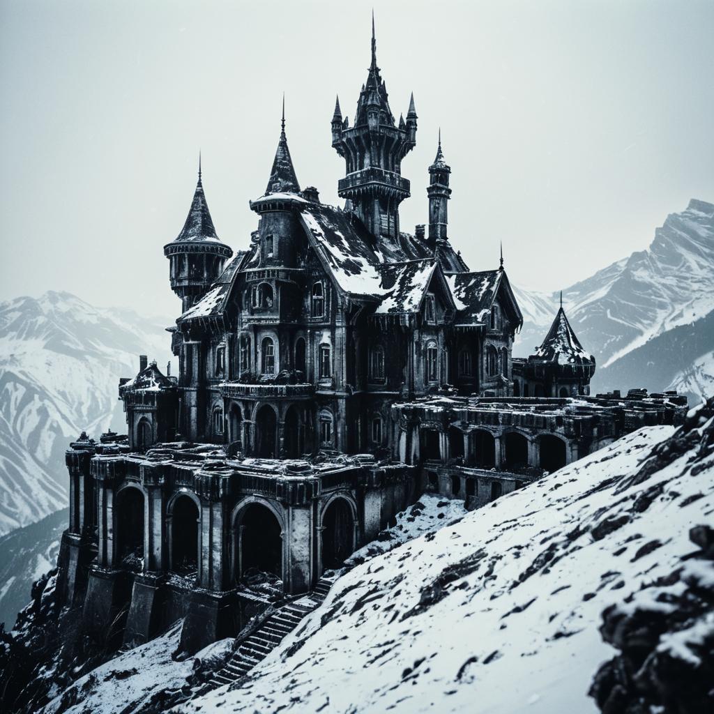 Dark steampunk-style castle with multiple tall, pointed towers and intricate detailing, surrounded by a misty, foggy atmosphere at dawn. The scene features subtle lighting inside the castle, drizzling rain, and barren trees, creating a mysterious and moody ambiance.