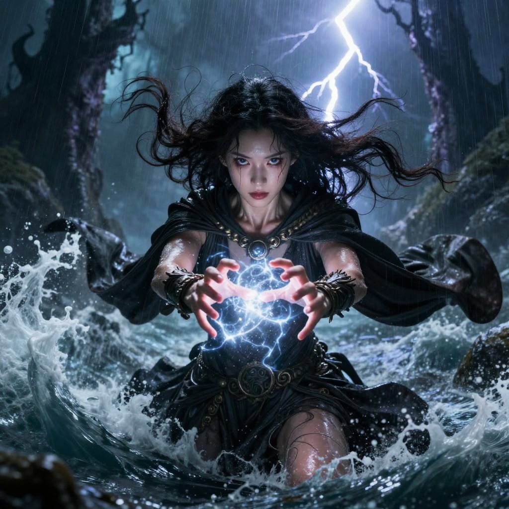 Photorealistic image of a fierce female sorceress with long flowing hair and a black cloak, kneeling in a stormy ocean with waves splashing around her. She is conjuring a glowing, magical energy ball of water and lightning between her hands during heavy rain and lightning strikes. The scene is dark and dramatic, set on a haunted island with a gothic atmosphere.