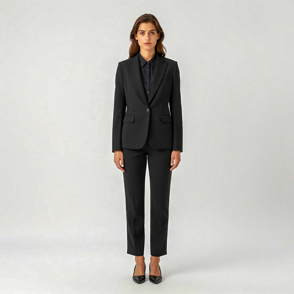 Full body portrait of a fair-skinned woman with medium-length brown wavy hair, wearing a black tailored blazer, black collared shirt, and matching black pants. She is standing in front of a plain white background with a neutral expression, dressed in professional business attire and black flats. Studio lighting enhances the clean and simple composition.
