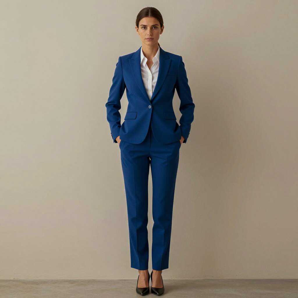 Black formal attire, photograph of a woman standing in front of a plain white background, wearing a black blazer and black pants, black shirt with a collar, black flats, medium-length brown wavy hair, fair skin, neutral expression, minimal makeup, professional business attire, full body shot, front-facing, studio lighting, clean and simple composition