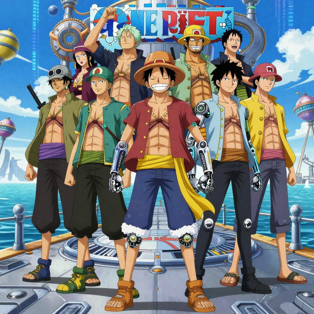 A grand One Piece AI pirate crew portrait featuring anime-style characters augmented with cybernetic limbs and glowing neural implants, standing on a mechanical dock with an ocean of data streams, bold colors, detailed futuristic backgrounds.