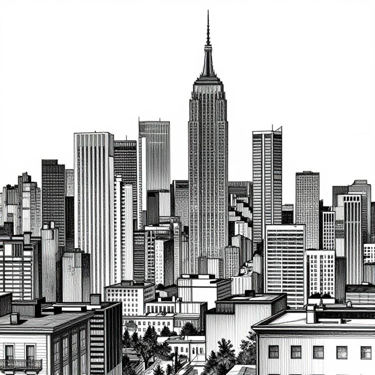 This black-and-white digital drawing in a comic book style depicts a bustling city skyline. The central focus is on the Empire State Building, a tall, slender skyscraper with a pointed spire, surrounded by various other high-rise buildings of varying heights and architectural styles. The foreground includes shorter buildings and trees, adding depth to the urban scene. The image uses bold, clean lines and high contrast to emphasize the geometric forms and textures of the buildings, creating a dynamic and visually engaging cityscape. The background is stark white, making the detailed cityscape stand out prominently.