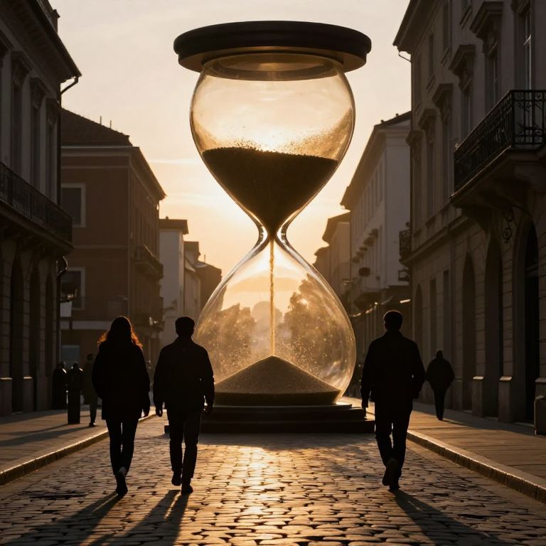 Silhouetted figures stroll along a cobblestone street as the golden sunlight filters through a colossal hourglass, its sands suspended in mid-air, casting a unidirectional glow that illuminates the timeless scene.