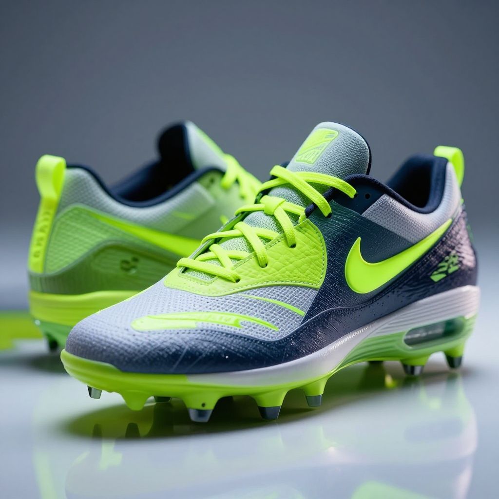 Close-up of nike air max cleats with bright neon accents, futuristic style studio lighting, high detail reflections, sports gear theme, emphasis on comfort and performance features