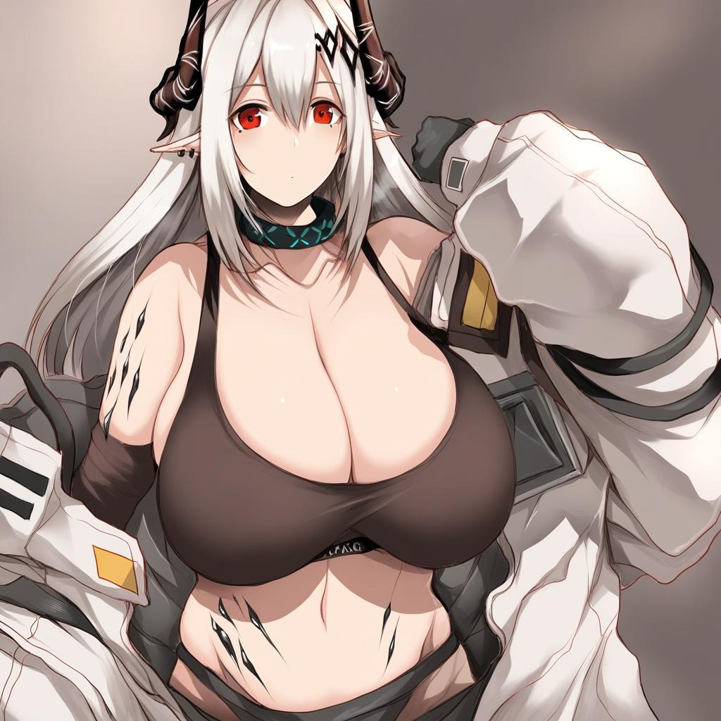Mudrock (elite ii) (arknights), arknights, 1girl, pointy ears, horns, ear piercing, red eyes, hair between eyes, long hair, white hair, grey hair, hair ornament, large breasts, cleavage, navel, black sports bra, black gloves, bare shoulders, off shoulder, long sleeves, black choker, oripathy lesion (arknights), material growth, infection monitor (arknights), crop top, midriff, stomach, by artist tsukasawa takamatsu, leet