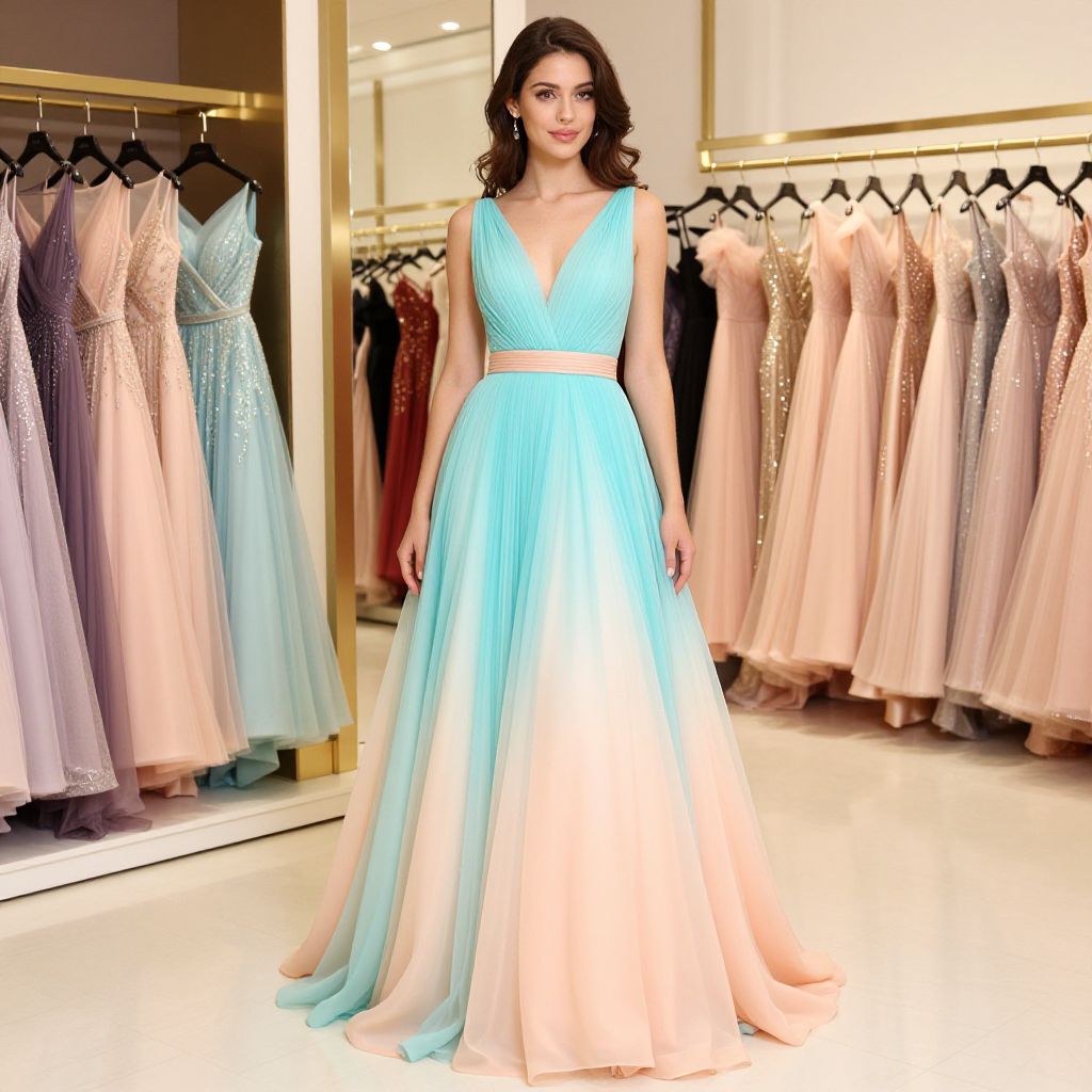 This elegant image features a woman in a stunning gown, showcasing a blend of soft pastel colors that transition beautifully from turquoise to peach. The luxurious boutique setting highlights a collection of glamorous dresses, perfectly complementing the fashion-forward vibe of the scene.