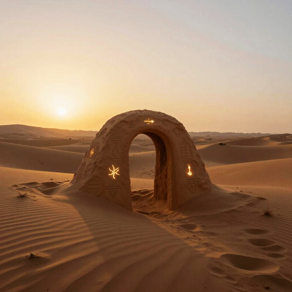 Mysterious hoftor gateway half-buried in sand dunes, ancient symbols glowing faintly, desert sunset casting warm hues, ethereal atmosphere, fantasy concept art