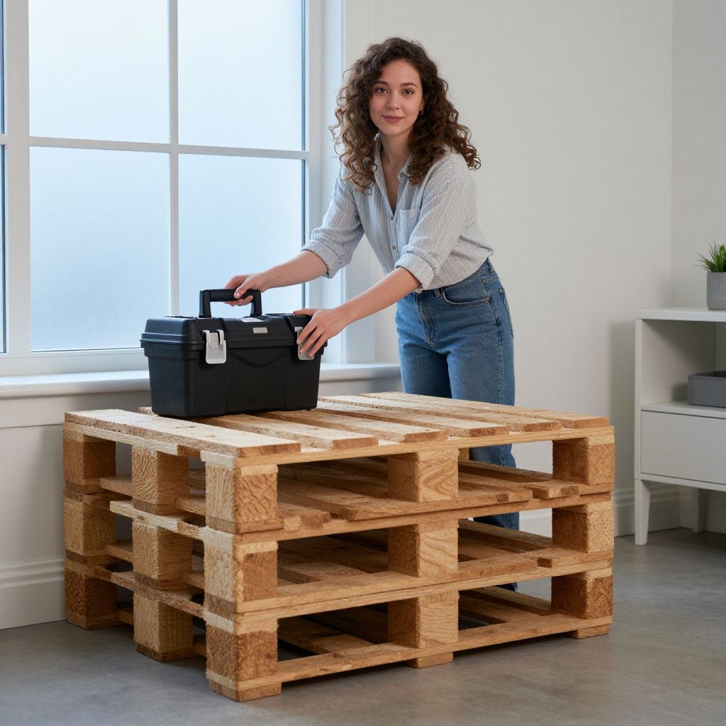 A well-lit interior shot of a modern apartment where a repurposed wooden pallet is used as a sturdy storage platform beneath a window, with soft blue morning light streaming in, a woman in her late 20s with brown curly hair and friendly eyes standing nearby, adjusting a toolbox on top of it.