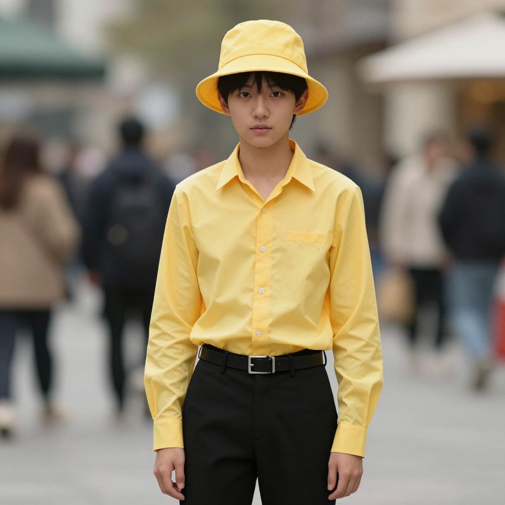 "gold digger hat costume, 1boy, male focus, solo, pants, belt, shirt, looking at viewer, hat, blurry, blurry background, yellow shirt, collared shirt, standing, long sleeves Realistic photo of casual sexy person with pretty face"