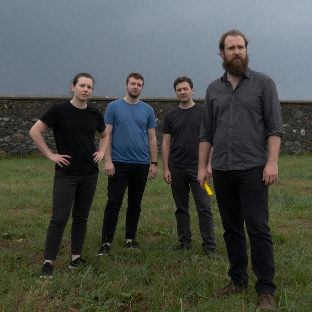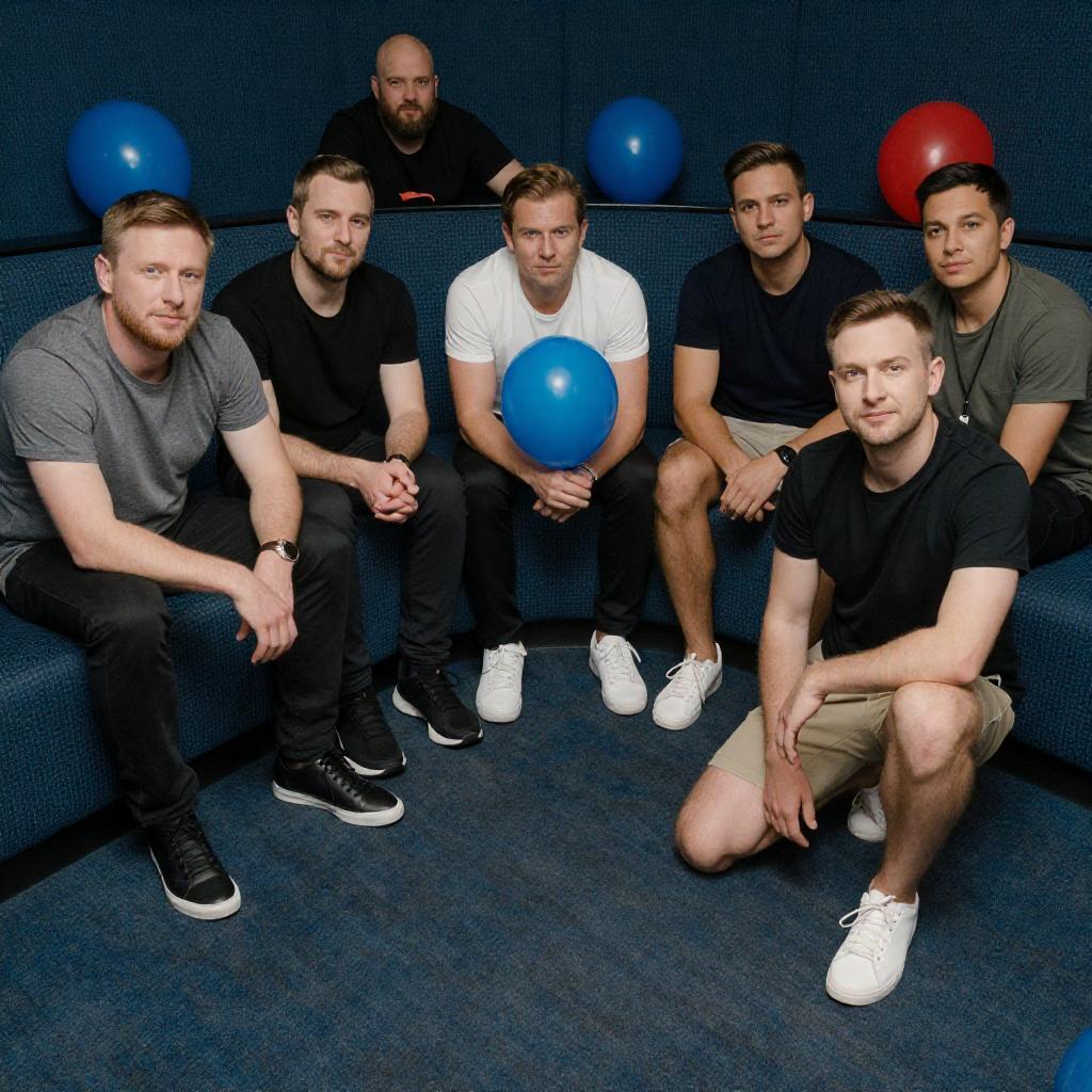 Photograph of six men on a blue patterned couch and floor. Five men sit, one kneels. Casual clothing, sneakers. Bald man with beard in background, others with short hair. One holds a blue balloon. Blue and red balloons in background. Patterned carpet. Intimate, relaxed setting.