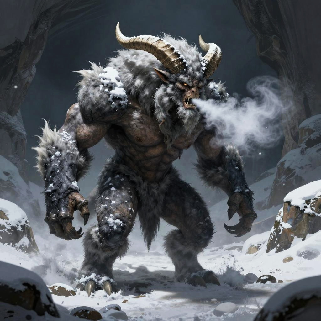 Four legged monster in a snowy mountain cave, thick fur blending with ice and snow, powerful build with menacing horns curving backward, breath visible in the cold air, dramatic shadows, dark fantasy concept art, hyper detailed