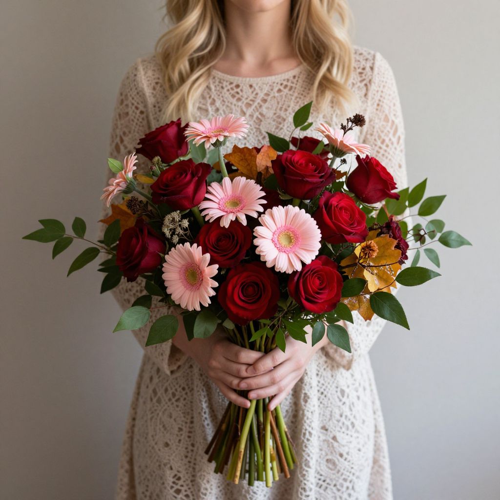 Blonde-haired woman in a delicate lace dress holds a vibrant autumnal bouquet featuring deep red roses, soft pink gerbera daisies, and lush green foliage, creating a boho-chic aesthetic against a neutral background.