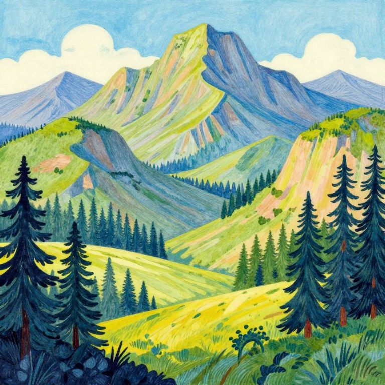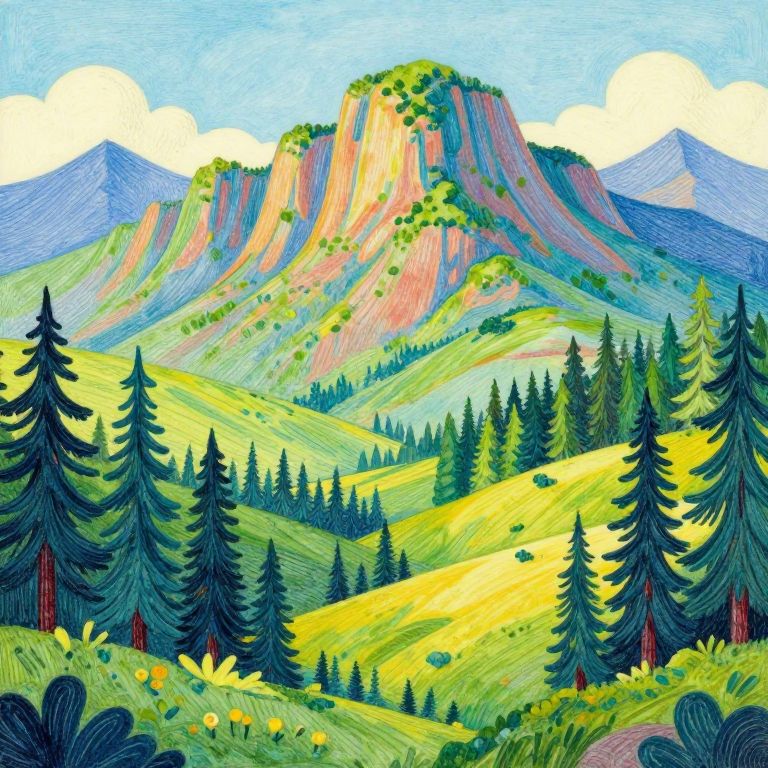 Robert Mccall a drawing of a landscape with mountains and forests in a neo-fantasy style, bright colors,