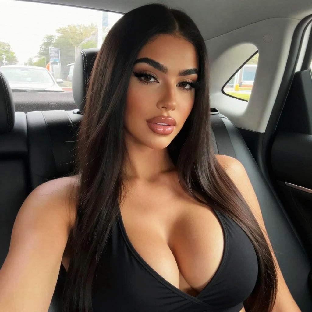 Photograph of an attractive young woman with long, straight, dark brown hair and dark eyebrows, sitting in a car's backseat. She has olive skin, full lips with a subtle pink gloss, and is wearing a black, low-cut top that shows a significant amount of cleavage. Her makeup is bold with dramatic eyeliner and mascara. The background shows the car's black leather seats and a blurry exterior.