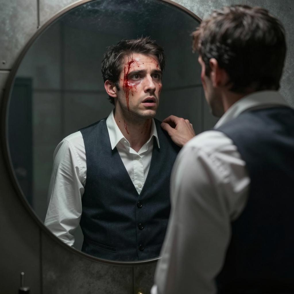 Two men in a dark, tense confrontation. Blood on the face of the man in the foreground, looking shocked. He has dark hair, wearing a dark vest over a white shirt. The man in the background, with dark hair, faces away. They are in front of a round mirror, reflecting their upper bodies. The background is a dimly lit, industrial setting with metal panels. The man in the foreground grips the other's shoulder with his right hand.