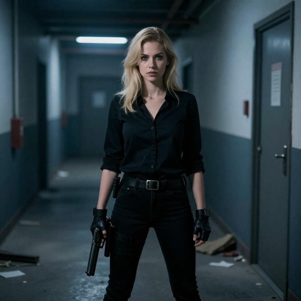 Photograph of a blonde woman with wavy hair, holding a black handgun in her right hand. She has purple eye makeup, visible bruises on her left arm, and wears a sleeveless, dark-patterned top with black fingerless gloves. She stands in a modern, industrial setting with fluorescent lights in the background. Her intense gaze is directed at the camera.