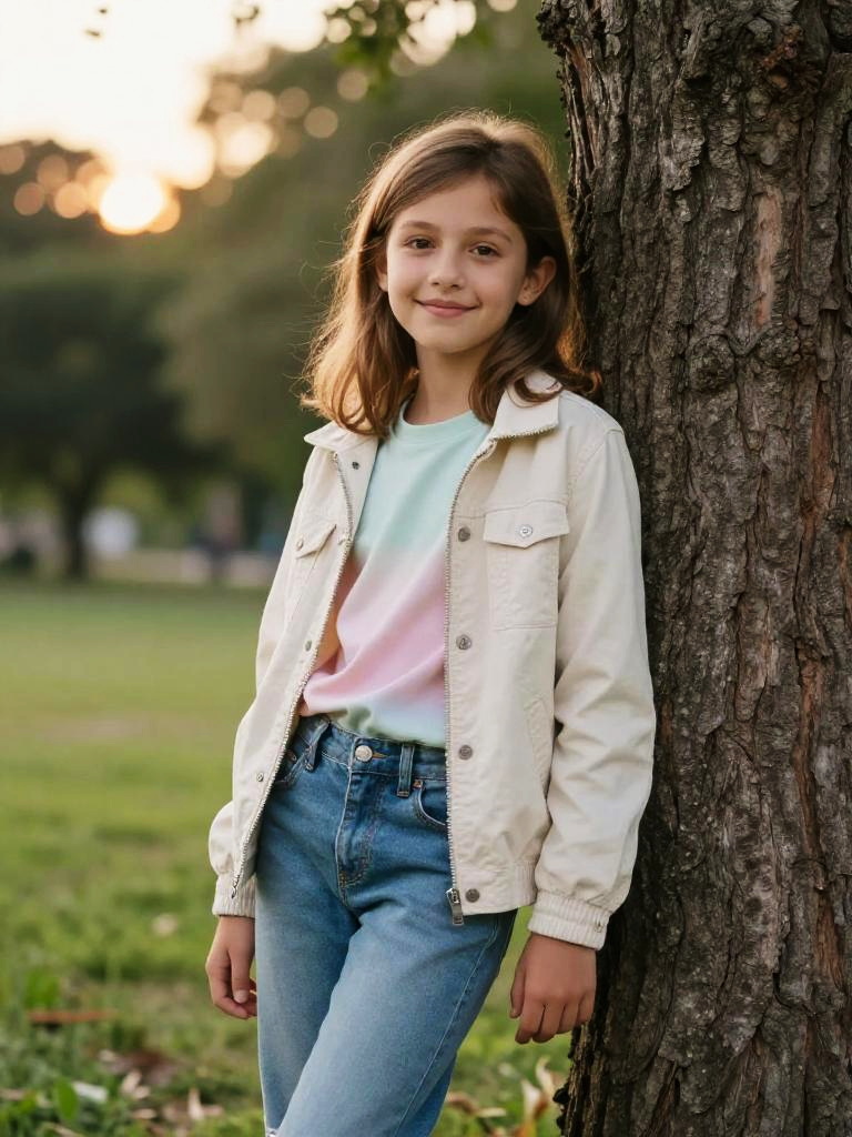 9 years old girl lifestyle photo, olive-skinned girl with light brown hair and gentle grin wearing light jacket over a pastel T-shirt and casual jeans, leaning casually against a large tree trunk in a park, one shoulder resting on the bark, smiling toward the camera, blurred greenery and soft sunset light in the distance, open grassy field with trees fading into the background