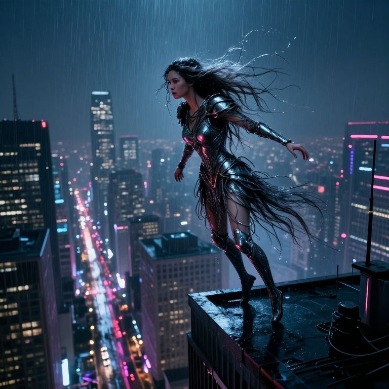 Digital artwork of a female figure with robotic limbs, upside down, flying through a futuristic cityscape with tall buildings and glowing lights. She wears a metallic