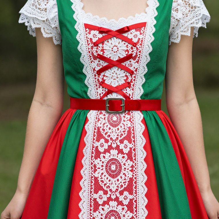 Female wearing a green and red dress with white lace and a red belt.