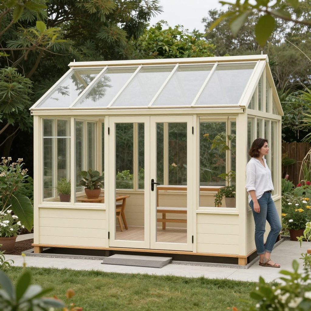 Compact wooden greenhouse with cream-colored siding and large glass-paneled doors stands prominently in a lush garden, featuring a woman in casual attire standing beside it, showcasing its spacious interior with furniture visible through the transparent panels.