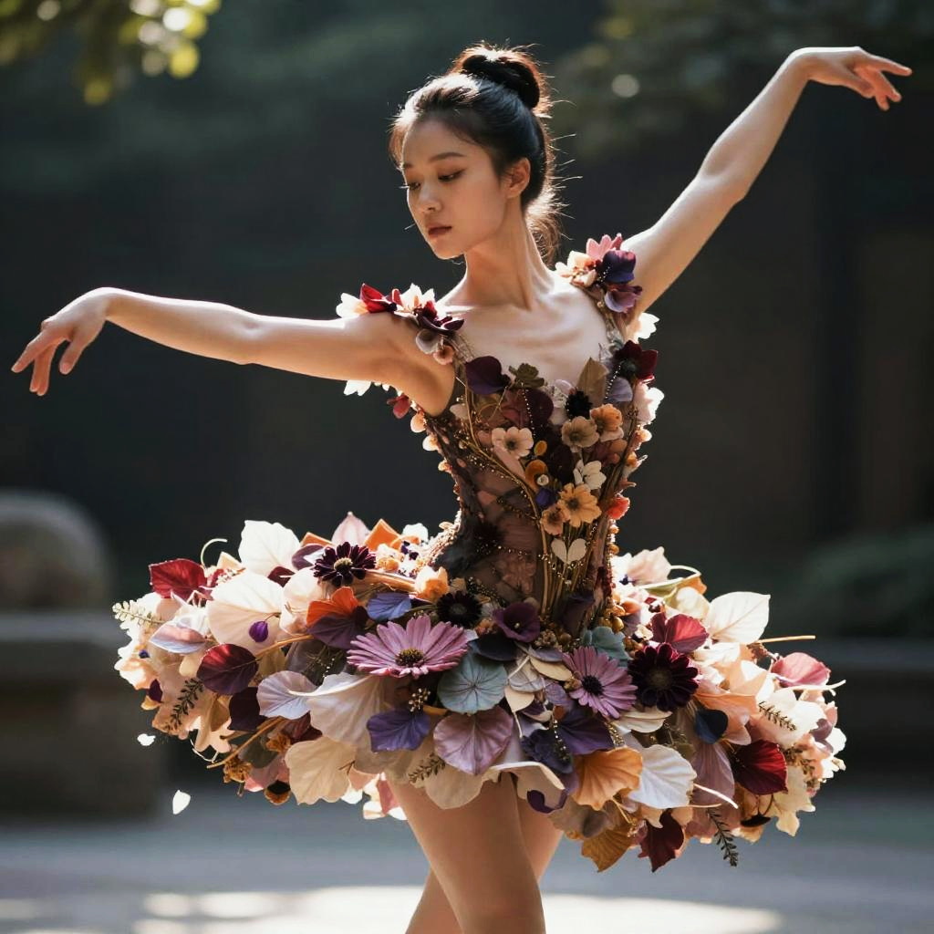 Photorealistic image of a young Asian female ballet dancer wearing an intricate tutu dress made entirely of multicolored petals and leaves. The dancer is posed gracefully with arms extended, bathed in soft natural sunlight against a blurred outdoor background. The floral costume features layered textures and a biophilic design, highlighting delicate flowers in shades of purple, pink, beige, and burgundy. The dancer's hair is styled in a neat bun, emphasizing her elegant posture and expression.