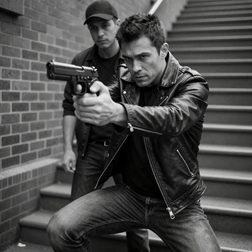 Photograph of a man with dark hair, black leather jacket, aiming a handgun at a blue metal door. Brick wall on the left. Man has intense expression, right arm raised, left arm supporting gun.